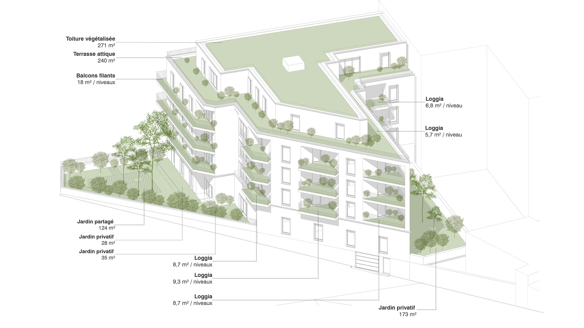 L’immeuble est conçu pour maximiser l’exposition solaire et les vues paysagères grâce à son orientation vers l’ouest et le sud-ouest. Les logements bénéficient de généreux espaces extérieurs :