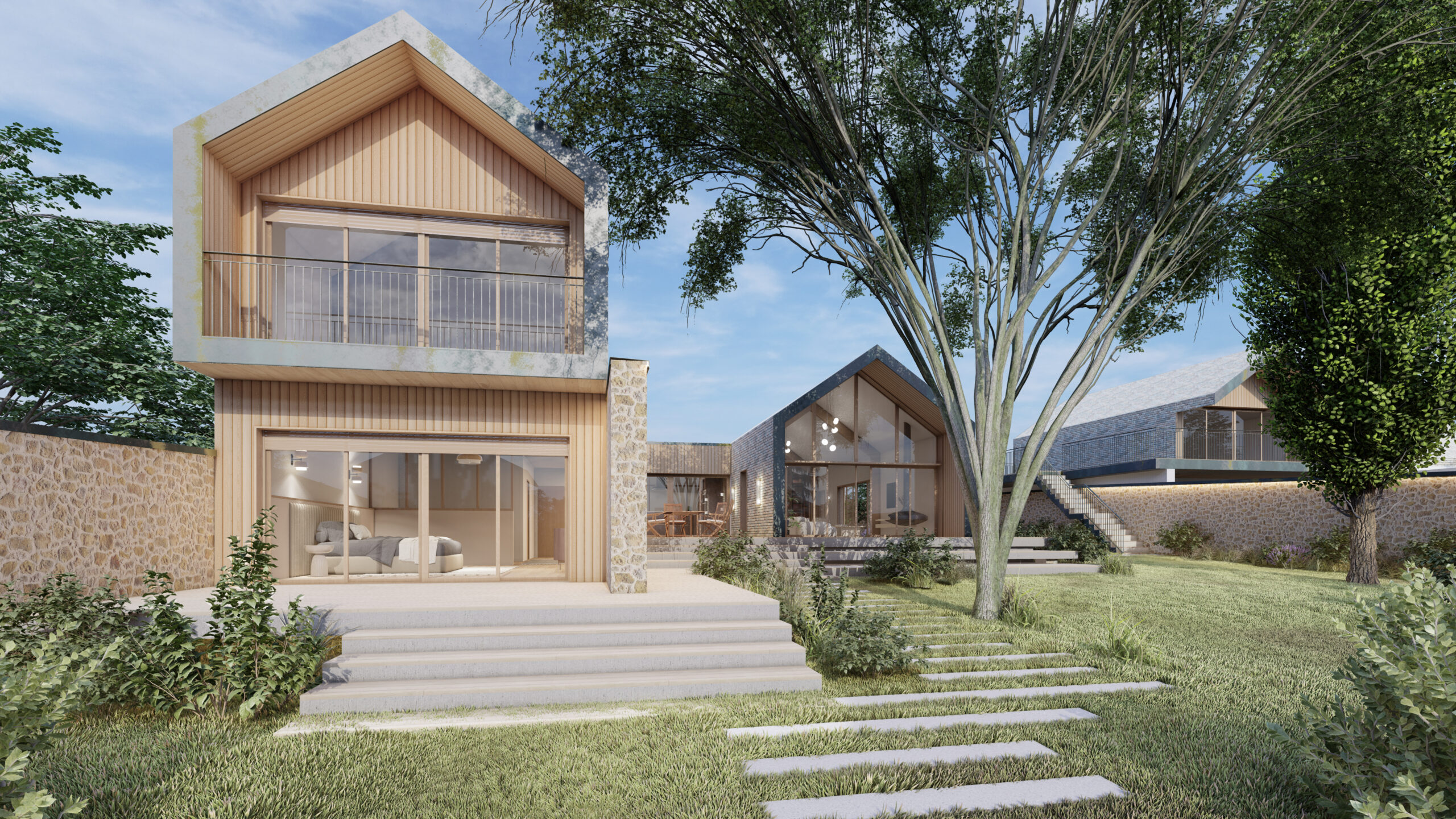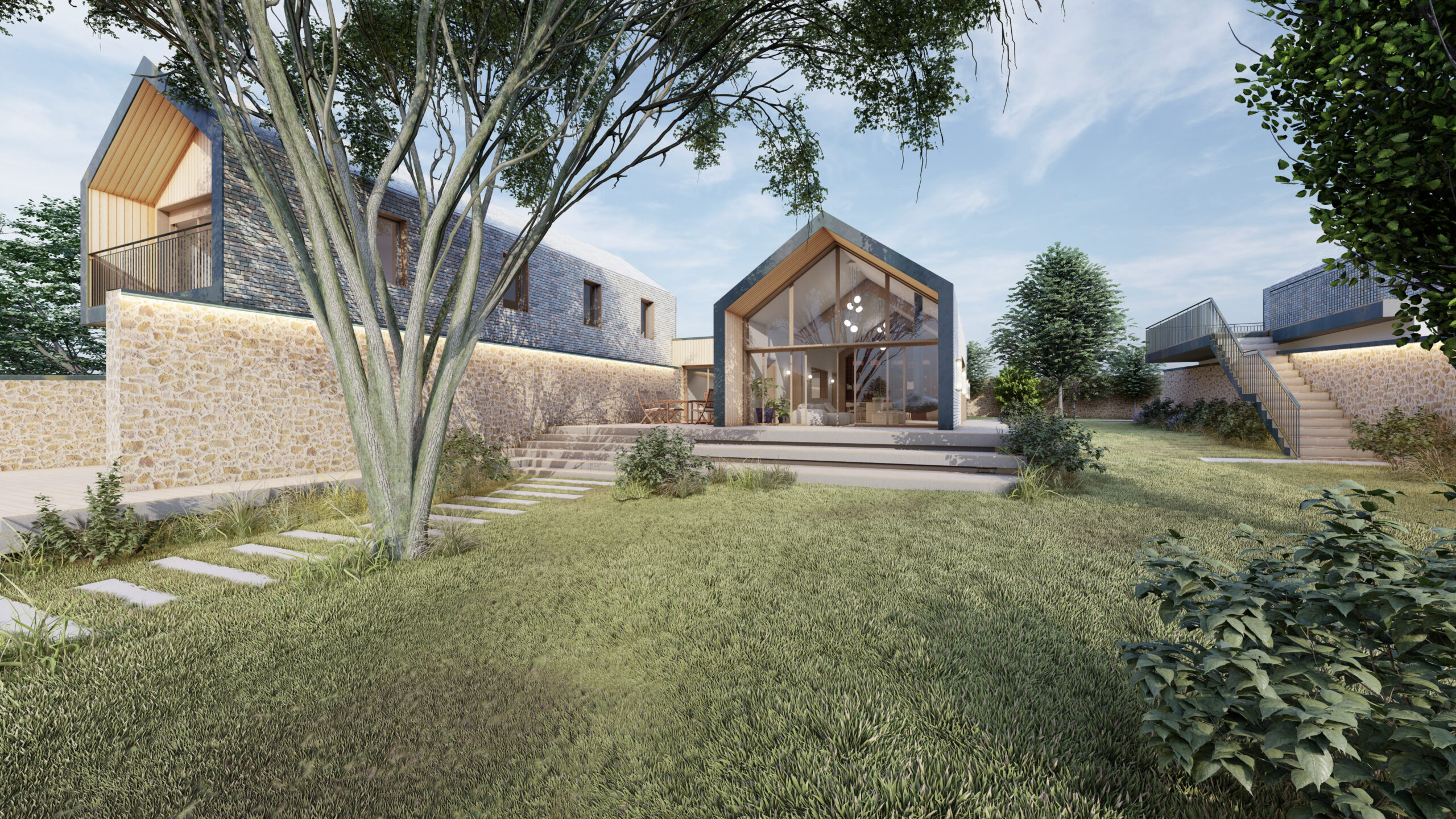 Plutôt que de construire massivement, le projet s’articule entre murs et nature, jouant avec les vides, les alignements et les respirations du terrain.