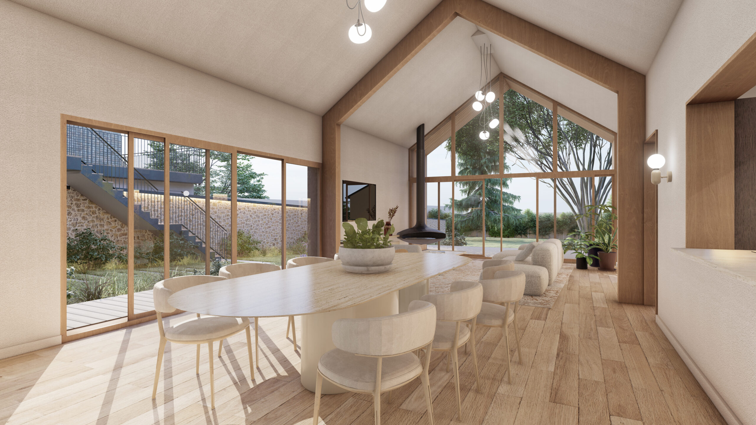 -au cœur du projet, une séquence d’espaces de vie ouverte sur la végétation.