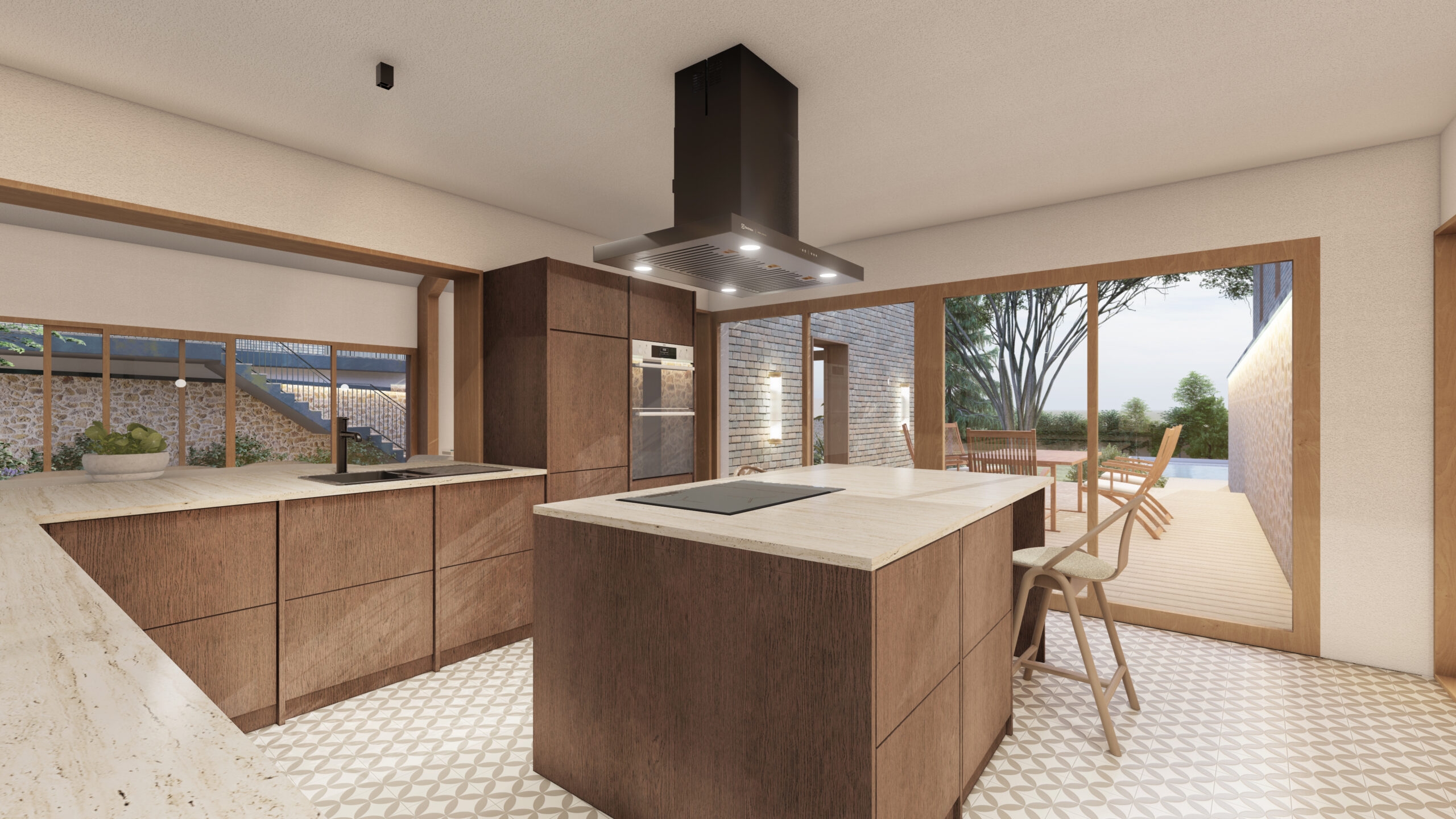 La cuisine occupe une position centrale : elle relie le séjour d’un côté et un patio intérieur de l’autre.